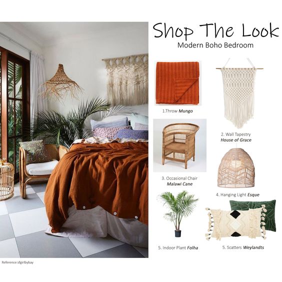 This Month on ‘Shop the Look’ we get inspired from the Boho traditional styles and show how we can incorporate a relaxed bedroom look with a bohemian twist. Boho has been associated with writers, intellectuals and artists for over 200 years. It incorporates various ethnic styles representing cultural creativity and indifference to social structure and traditions. We incorporate this 1950’s Craft Era style when we combine natural elements with handmade.The style is all about natural textures, creamy to terracotta tones and layering the space with scatters, throws and occasional furniture which can be organically placed to your taste.