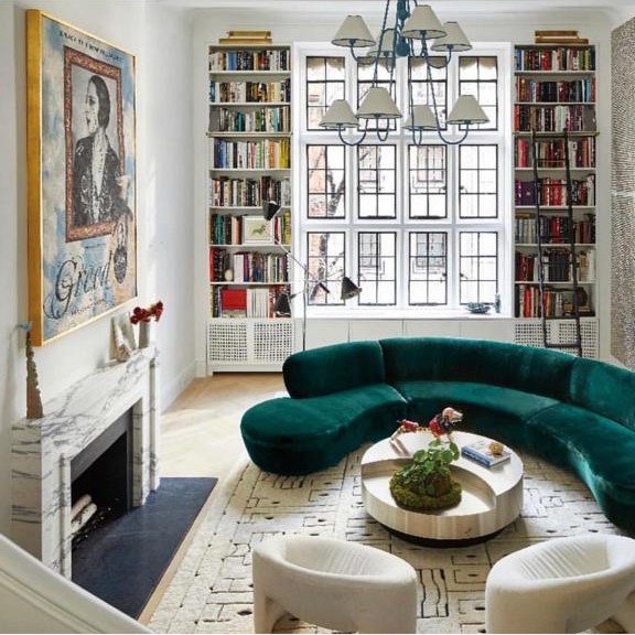 Conjuring the perfect setting in Upper East Side, we love the cosy yet sophisticated setting of this home. The shell of the apartment is Victorian inspired with high ceilings, crisp white walls and floors with a herringbone design. The library symmetrically mirrors the space making it appear vertically longer. Neutral tones have been layered to create a successful scheme with the herringbone design on timber floors, soft textured rug, occasional chairs upholstered in velvet and contrasting rough textured over-sized panels on the wall. The apartment feels luxurious from the organic curves of the furniture, with velvet in a rich dual tone that pops the subdued room.