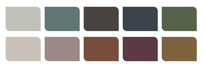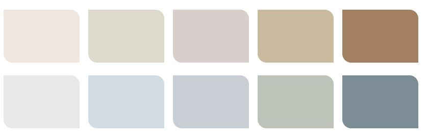 Pair this palette with pale timbers such as ash or light wood washes. Add a combination of plush fabrics such as velvets. Bring in natural elements such as cotton and wool to keep it warm and contemporary. To create a more luxurious feel add metallics such as copper, gold or silver as any of these would work with this diverse palette which ranges from greys to creams. Create a sense of calmness and relaxation with this muted palette.
