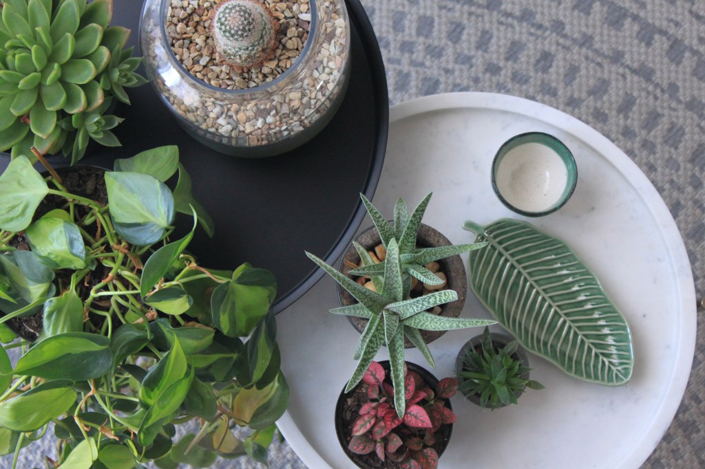 Adorn your side tables all in greenery with plants that are easily maintained such as succulents or cactus. Contrast the planters in glass or ceramic pots in different sizes to create diversity.