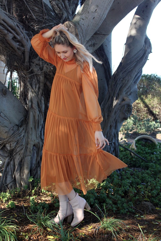 The slip dress is easy, trendy and versatile in many ways. The light garment can be layered over anything. Under the garment is a simple slip dress in copper which works beautifully with the intricate details of the translucent dress.