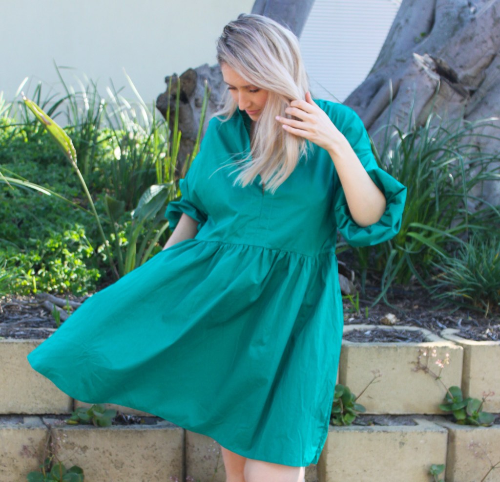 This cute doll dress in Jade makes it comfortable and easy going in this pop of colour. The oversized sleeves and slim line stitching details around the waist, makes this dress flattering and a contemporary piece in your wardrobe. Available in a longer version in black or white and made from 100% cotton.