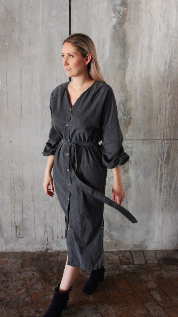 This sexy shirt dress comes in charcoal with equally symmetrical buttons running down the dress. The puff sleeves and the cotton belt around the waist make a point of difference with this carefully designed piece.