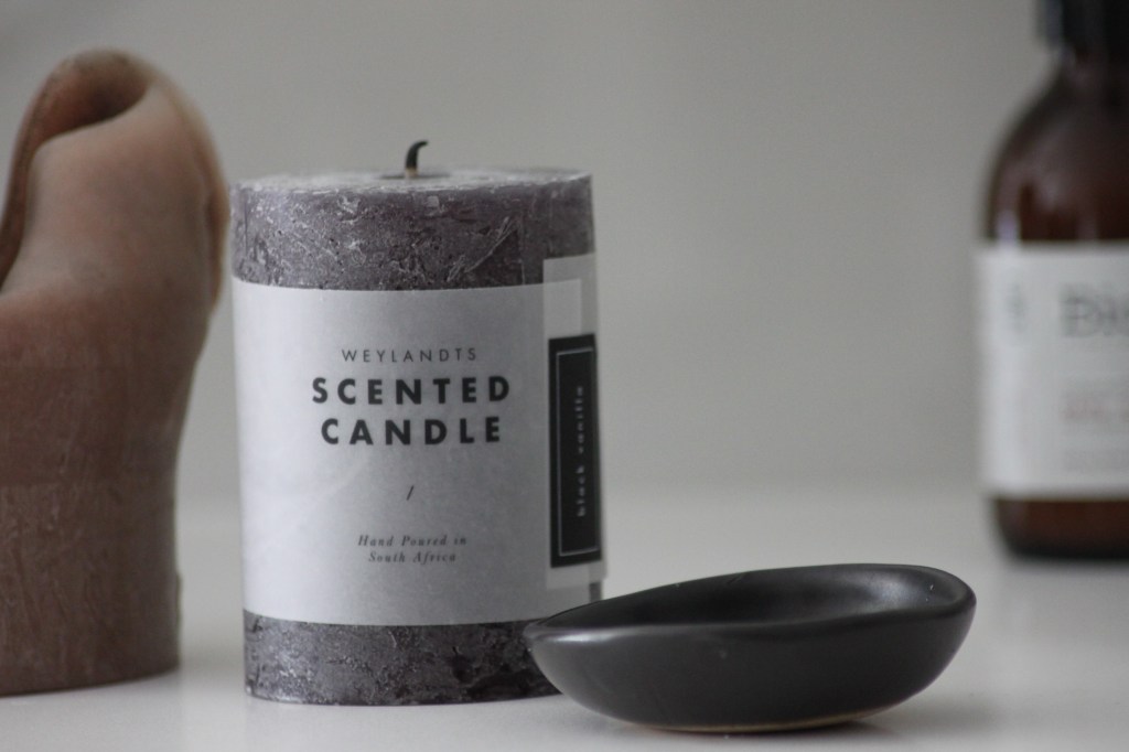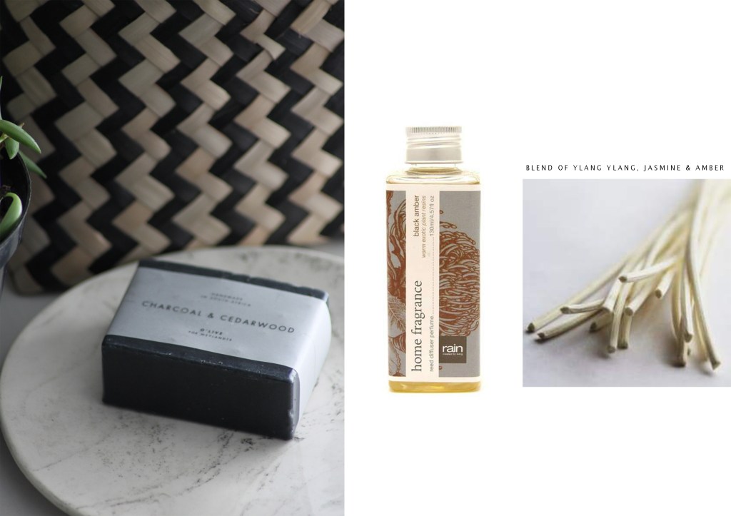 The chunky black vanilla scented candle and organic charcoal & cedarwood soap, Weylandts. Botanical hand and body wash with blends of marula and baobab oils, Rain. Artisan matt black bowl, Mervyn Gers Ceramics. I hand selecting these products that have been thoughtfully created, hand-made and sustainable, they work beautifully in the setting in terms of texture, form and smell.